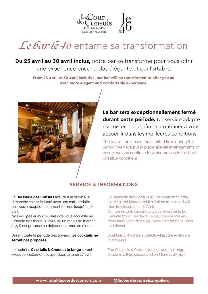 Nos services – le restaurant gastronomique Le Cénacle, La Brasserie des Consuls, le Bar 46, le Spa, ainsi que nos espaces de réception – ont été pensés pour accueillir aussi bien les voyageurs que les Toulousains, dans un esprit de partage et de convivialité.